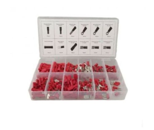 260-Piece Red Insulated Cable Lugs Assortment. Ring terminal lugs 4.3mm - 20 pieces Ring terminal lugs 5.3mm - 20 pieces Ring terminal lugs 6.4mm - 20 pieces Flat plugs 6.3mm - 30 pieces Flat connector sleeves 2.8mm - 20 pieces Flat connector sleeves 4.8mm - 20 pieces Flat connector sleeves 6.3mm - 20 pieces Flat connector sleeves 6.3mm (fully insulated) - 30 pieces Ball connectors Male 4mm - 30 pieces Ball connectors Female 4mm - 30 pieces Butt connectors 3mm - 20 pieces