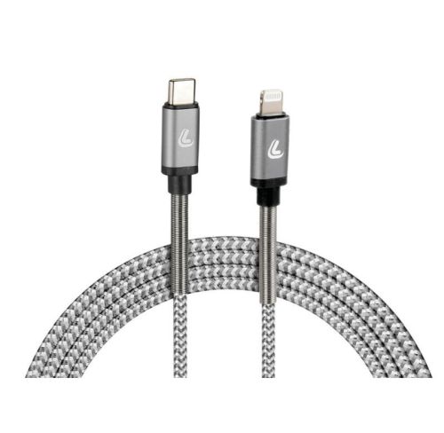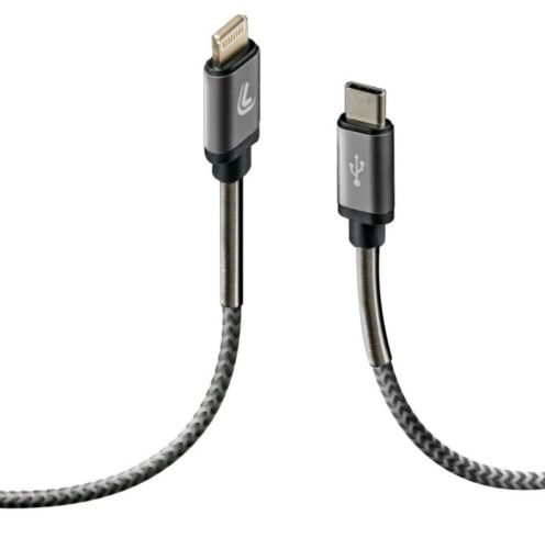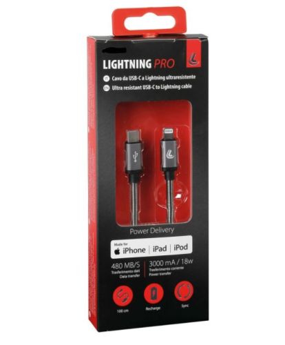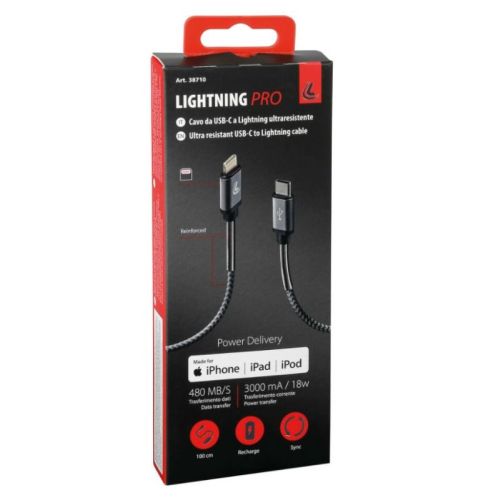 "Cable Usb Type-C > Lightning - 100 cm Recharge and data. Supports Power Delivery technology. Nylon braided, ultra resistant, reinforced neck and aluminium structure"