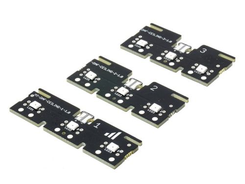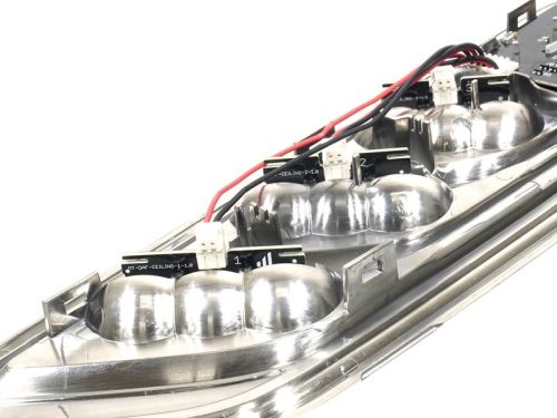 "LED emitters with 3 bright LEDs each, that replace the original LED emitters, that only has white light. The original ceiling lamp is removed and opened. The glass and reflector are taken out. The reflector is firmly secured in its six anchor points, therefore we recommend using our disassembly kit or a similar tool for removal. The original LED boards can then be easily unplugged and removed. The new LED boards click directly into the same positions as the originals. Please note that all three boards have different sizes/lengths and must be installed in the correct order. Our light sources are numbered 1, 2, and 3. Reassemble the lamp ? done. The original reading light (the large black circuit board) remains unchanged. -> You will need 2 pcs. (6 emitters in total) for one truck. ? Color: