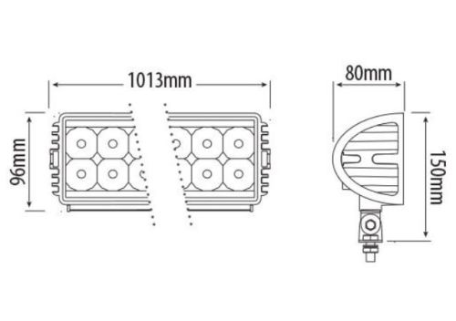 ?1013x80x96mm ?12-28 Volts ?144 Watts ?13500 Lumens ?60 White LEDs ?Rated IP67 ?Polycarbonate Lens ?Aluminium Housing ?Shock Resistance ?Stainless Steel Mounting Brackets ?1013*96*80mm ?ECE Approved Reg 10 ?Operating Temperature -20C to +40C ?Current Draw @ 12V : 10.3A ?Current Draw @ 24V : 5.13A