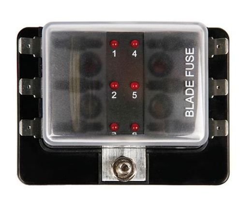 6 different devices may be connected to one single power source. The LEDs point out when fuse is broken. Suitable for a standard balde-fuse from 5A to 30A.