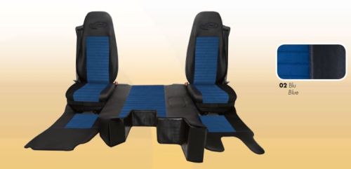 For Scania R2 >2009 (1x standard air seat + 1x folding seat passenger side) / 2 seat covers + engine cover + floormats / Special edition / Black-blue