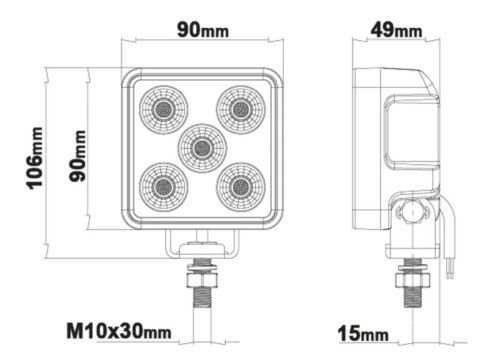 "Luna SQ30 at 30W with high quality Osram LEDs and mounting details in stainless steel. Useful light in a small package which can be mounted hanging, standing or sideways. When you want a slightly more targeted light scattering in your undertaking. Characteristics: ECE R10 (EMC-rated) Lumen: 3800 lm (theoretical), 2330 lm (actual) Color temperature: 6200K (cold white) Light scattering: 45? Power: 30W (20 x 1,5W Osram LED) IP67/IP69K (dustproof & can withstand hot water under pressure) - Read more about IP-rating here Voltage: 10-32V Dimensions and weight (excl. Brackets): Width: 90 mm Height: 106 mm Depth: 49 mm Weight: 600 gram"