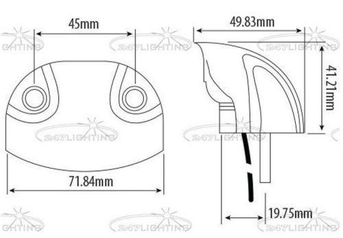 10-30 Volts NP: 1W Number plate IP67 Rated ECE Approved Reg 4 Polycarbonate Lens ABS Body Surface Mounted With Two Self-Tapping Screws 250mm Cable Dimensions: 71.8*41*19.7mm Operating Temperature: -40C To +65C