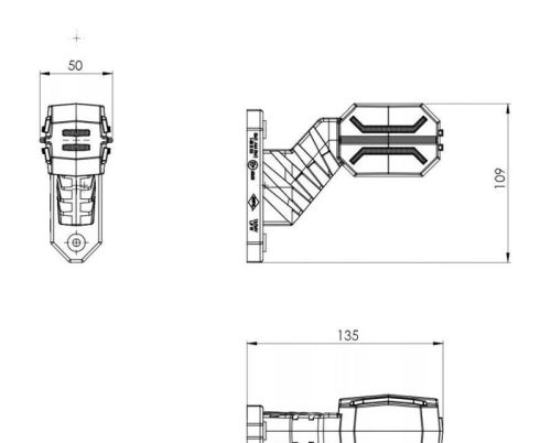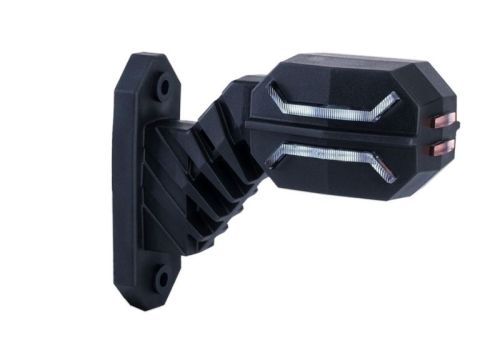 "This is a three-function marker lamp on a long diagonal arm, designed to be mounted on the left side of the vehicle. The lamp operates on a universal voltage of 12/24 V and is characterized by low power consumption. Only branded diodes are used for production, which definitely distinguish the quality of lighting and attractively emphasize the outline of a moving vehicle. It has an interesting design is intended for use in trucks and agricultural machines, trailers and semi-trailers. Lamp functions: ? rear position light (red light color) ? 6 diodes ? front position light (white light color) ? 6 diodes ? side marker light (orange light color) ? 4 diodes Product is fully hermetic (ingress protection rating IP 68), and the operating temperature range is from -30 degrees C to +50 degrees C."