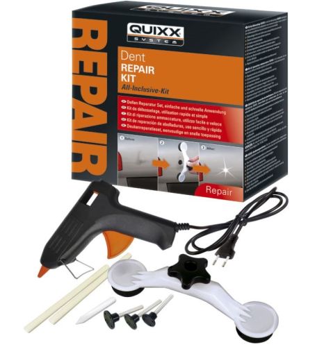 "The QUIXX Dent Repair-Kit, developed by car body professionals, provides a quick and inexpensive remedy for dent problems. If the paint of your car has not been damaged by the dent it can be flattened also by nonprofessionals with the QUIXX Dent Repair-Kit. Specifications: - Professional quality DIY dent repair kit - Removes dents without damaging the paint - Suitable for most dents in flat car body areas - Simple and fast application - Developed and used by repair professionals - Helps avoid costly repairs and maintains value - All-Inclusive-Kit: contains everything you need for the repair process Contents: 1 Repair Bridge 3 Dent Removal Stems in different sizes 1 Hot Glue Gun 2 Special Glue Sticks 1 Plastic Stick for removal of glue residues 1 Instruction Sheet"