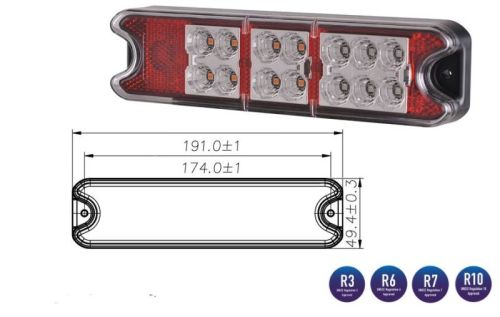 ? 12V + 24V ? 18LED ? Wire 30cm ? Stop/Tail/Indicator/Reflector ? ECE R3/R6/R7/R10 ? Lens PMMA ? Housing ABS ? Screw mounting