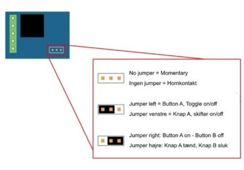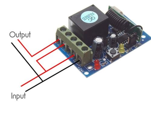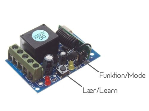 "A wireless relay-controller for 12V with a 1-channel / output, 433mhz. The 3 built-in functions give you many possibilities. The controller has a learn-function, so that you can register multiple remotes to the same controller. It is possible, for example to have multiple remotes for one controller, but also possible to have the same remote for multiple controllers - max 8 can be programmed at the same time. Protected remote is ready for use, battery is already mounted. You can easily change the battery when this is needed. There is a jumper inside the relay, that can be placed in three ways (left, right or no jumper). It is the placement of this jumper that decides in what way the relay operates. The three functions can be seen below: Toggle: Push button A for turning on, push A again for turning off. Latch: Push button A for turning on, push B for turning on. Momentary / push-on: Only on when button A is pushed down. The learn-button is used to register the ID of the remote in the controller. When you push the learn-button - a yellow LED will turn on, afterwards you can push the wanted button on the remote. The LED will flash and the ID has been saved. To reset the controller, simply push and hold the learn button until the LED flashes. Connecting Each relay output is marked with A and C, while the relay input is marked with B. Using normal relay designations, A is "NO" (normally open) while C is "NC" (normally closed). You can use the two outputs to get power when the relay is off or when the relay is on. You can also use both. ? Dimension on controller: