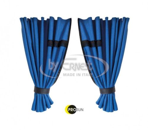 ? BLUE curtains ? Finished with black leather strap ? Height 2x 100cm ? Length 2x 215cm ? 2 curtain holders leather black ? No frills ? Hooks for hanging curtains included ? Glides for rail truck NOT included