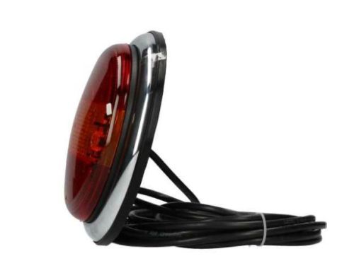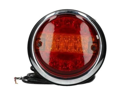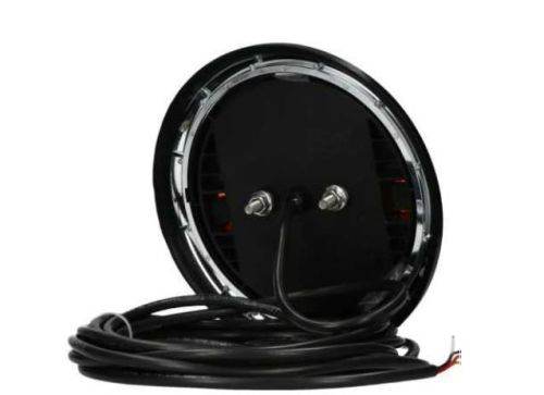"Stop-tail-direction indicator light, LED, 12/24V flat. Diameter: 140mm ? Height: 31mm Center distance: 45mm Bolts: M6. Connection: 5.0M cable with open end; wire color in accordance with supplied installation instructions. D-mark and e-mark approved. Comes with chrome-look flash mounting kit with plastic ring and rubber seal. "