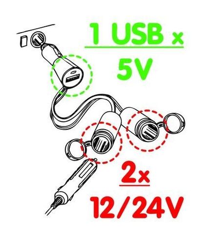 > Two-way cigarette socket + 1xUSB-port 12V/24V