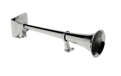 "The HADLEY 861 is a single 61cm horn. It has a round spout at the front (diameter 12.5 cm) and a square back part. A real "Heavy Duty" version that can take a beating! The Hadley is known for its "warm" sound and high-quality chrome. It is usually placed on one side of the vehicle. This model can also be mounted in a double version, each on one side, if two are ordered. This air horn is supplied as standard WITHOUT operation but with a support foot in the front. mounting and operating kit required example Ref.: 03402171 or 03402170 (for 1 or 2 horns) or u can order the pieces separately (= our ref. 03381416 of 03389098) Coupler for air supply to this horn to be ordered separately (= our ref. 03381657 or 03381362 or 03381363 or 03381364)"