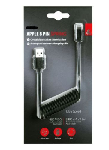 C?ble ressort Usb > Apple 8 Pin - 100 cm - Noir Le c?ble s'allonge si n?cessaire et revient ? sa position d'origine lorsqu'il n'est pas utilis?. Sp?cifique pour les voitures et les motos. Compatible avec la charge ultra rapide et la synchronisation des donn?es. 2400mA/12W