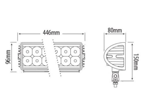 ?446x80x96mm ?12-28 Volts ?72 Watts ?5400 Lumens ?24 White LEDs ?Rated IP67 ?Polycarbonate Lens ?Aluminium Housing ?Shock Resistance ?Stainless Steel Mounting Brackets ?446*96*80mm ?ECE Approved Reg 10 ?Operating Temperature -20C to +40C ?Current Draw @ 12V : 4.32A ?Current Draw @ 24V : 2.17mA