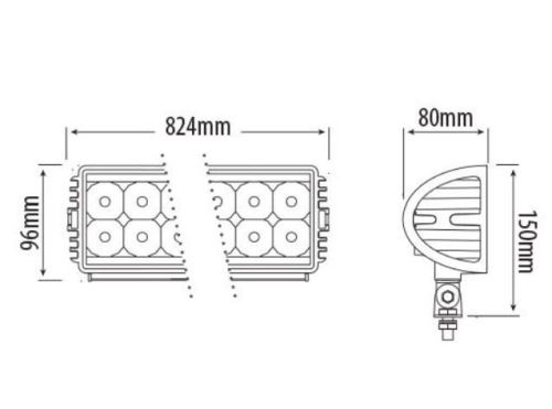 ?824x80x96mm ?12-28 Volts ?108 Watts ?10800 Lumens ?48 White LEDs ?Rated IP67 ?Polycarbonate Lens ?Aluminium Housing ?Shock Resistance ?Stainless Steel Mounting Brackets ?824*96*80mm ?ECE Approved Reg 10 ?Operating Temperature: -20C to +40C ?Current Draw @ 12V : 8.2A ?Current Draw @ 24V : 4.13 A