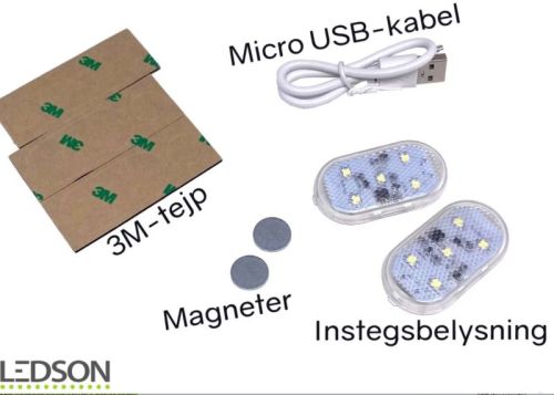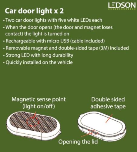 "Les ?clairages de porte de voiture de Ledson rendent plus s?r et plus confortable la sortie du v?hicule lorsqu'il fait un peu plus sombre ? l'ext?rieur. Avec cinq LED puissantes par lumi?re, vous ?clairez une zone suffisamment grande au sol pour entrer ou sortir en toute s?curit? de votre voiture ou camion. En plus, il a l'air sympa et moderne ! ? Deux ?clairages de porte de voiture avec cinq LED blanches chacun ? Lorsque l'?clairage de la porte de la voiture et l'aimant perdent le contact (la porte s'ouvre), la lumi?re de la porte s'allume ? Rechargeable via micro-USB (c?ble inclus) ? Rapidement install? sur le v?hicule ? Attach? avec un aimant et du ruban adh?sif double face 3M (inclus) ? LED puissantes avec une longue dur?e de vie ? 6 mois d'autonomie en utilisation normale Montage: 1. Trouvez un endroit appropri? sur la porte du v?hicule pour fixer l'?clairage de la porte 2. Fixez l'aimant sur le c?t? oppos? de l'endroit o? vous fixez l'?clairage afin qu'ils soient en contact ?troit lorsque la porte est ferm?e 3. Lorsque la porte est ouverte, l'?clairage de la porte est allum? 4. Lorsque la porte est ferm?e, l'?clairage de la porte est ?teint Ceci est inclus : 2 x lumi?res de porte de voiture 2 aimants 1 c?ble micro USB (30 cm) Ruban adh?sif double face 3M instructions de montage Dimensions: Longueur : 52mm Largeur : 28 mm Hauteur : 8mm"
