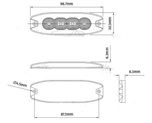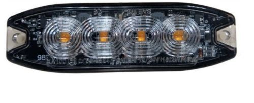 ?12-24 Volts ?12 Watts ?4 Amber SMD LEDs ?18 Flash Patterns ?Rated IP 67 ?Polycarbonate Lens ?Aluminium Housing ?Screw Mount ?180mm Cable Length ?Low Profile/Slimline ?Epoxy Resin Sealed ?Dimensions: 93*30*9mm ?ECE Approved Reg 10 | 65 ?Operating Temperature: -30?C to +50?C ?Nominal Current at 12V: 0.45A ?Nominal Current at 24V: 0.25A