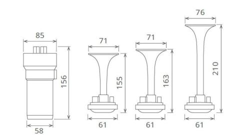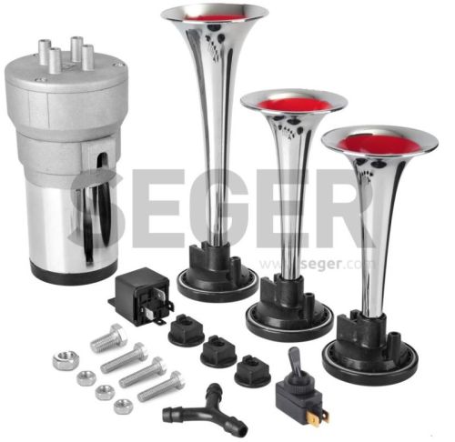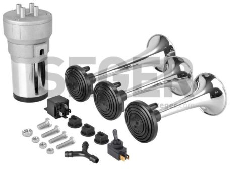 "? 12V / 14A / 115dB / 1Kg / cm? / 3 tons "Tour de France" ? Le klaxon ? air du compresseur a une m?lodie et 3 trompettes en PLASTIQUE DURABLE ENDUIT DE CHROME dans des longueurs de 15 cm, 16 cm. et 21 cm. respectivement. ? G?n?re de l'air sans r?servoir d'air ? bord car il dispose de son propre compresseur"