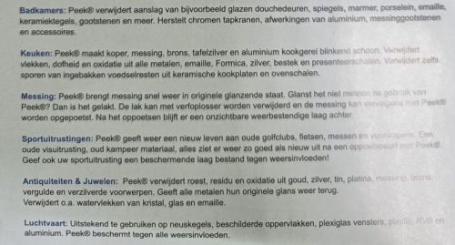 "Essayez-le et ?tonnez-vous du r?sultat! Lustre, nettoie, restaure et prot?ge tous les m?taux. Laiton, cuivre, acier inox, argent, or, chrome, bronze, aluminium, plexiglas et plus encore! Peut ?tre utilis?e sur nombreux types d'objets dans l'industrie automobile, le transport maritime, la restauration, le m?nage, et plus. Enl?ve entre autres l'oxydation, la rouille, des taches ternes ... Peek laisse apr?s utilisation une COUCHE DE PROTECTION durable. "