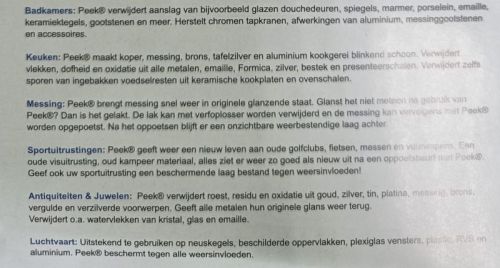 "Essayez-le et ?tonnez-vous du r?sultat! Lustre, nettoie, restaure et prot?ge tous les m?taux. Laiton, cuivre, acier inox, argent, or, chrome, bronze, aluminium, plexiglas et plus encore! Peut ?tre utilis?e sur nombreux types d'objets dans l'industrie automobile, le transport maritime, la restauration, le m?nage, et plus. Enl?ve entre autres l'oxydation, la rouille, des taches ternes ... Peek laisse apr?s utilisation une COUCHE DE PROTECTION durable. "