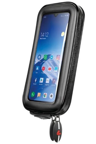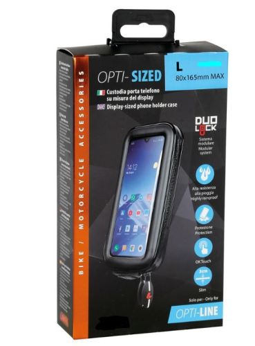"?tui universel Opti Sized pour smartphone - L - 80x155 mm ? Suit autant que possible la forme du t?l?phone, ?paisseur r?duite pour le rendre moins encombrant. ? Trou d'entr?e du c?ble de recharge. ? Film frontal transparent pour permettre l'utilisation de l'?cran tactile, fix? par thermoscellage pour augmenter la r?sistance ? la pluie. ? Zips lat?raux r?sistants ? la pluie. ? Poches internes pour cartes. ? Compatible avec toutes les fixations Opti Line (Notre ref. 03398701/03398702/03398703 -> requis pour montage) ? Syst?me de fixation rapide Duo Lock ? Sangle de s?curit? incluse ? Mesures int?rieures maximales 80x155 mm"