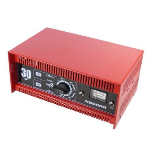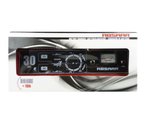 "Absaar Acculader 12 volt en 24 volt 30 amp Type batterij: lood-zuur, AGM Amp?re: 30A Volt: 12V / 24V Charging Type: Standaard Schakelbaar: N / E, 12/24V Minimum Ah: 30Ah Maximum Ah: 350Ah Jump Start Functie: 250 A Gewicht: 8,5 kg Afmetingen: 37 x 17 x 23 FUNCTIES Professionele standaard lader 250 Amp?re jump start Schakelbaar 12/24 Volt en een snelle of standaardtarief Robuust gepoedercoat metalen behuizing. "