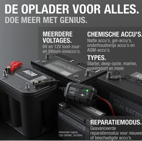 "De introductie van de nieuwste Genius5EU, een van onze krachtigste, meest presterende, energiezuinige en compactste lader tot nu toe. De Genius5EU is een 6 Volt en 12 Volt acculader, een accu-onderhoudslader en een accu desulfator met 5 amp?re voor loodzuuraccu's, scheeps- en semi tractie-accu's, inclusief natte, gel-, AGM- en onderhoudsvrije accu's, plus lithium-ion accu's. De krachtigste, meest krachtige, energiezuinige en compacte lader tot nu toe 6-volt en 12-volt acculader, onderhoudslader en accu desulfator met een nominale spanning van 5 amp?re Laadt lege accu?s tot 1 Volt op De Genius5EU is een ultracompacte en zeer effici?nte 5-Amp 6-Volt en 12-Volt acculader, onderhoudslader en accu desulfator voor loodzuuraccu's, scheepvaart- en semi tractie-accu's, inclusief natte, gel-, AGM- en onderhoudsvrije, plus lithium-ion-accu's. Een ge?ntegreerde thermische sensor detecteert de omgevingstemperatuur en wijzigt de lading om het overladen in warme klimaten en het onderladen in koude klimaten te elimineren. Laad lege accu?s tot 1-Volt, of gebruik de nieuwe Force Mode die u in staat stelt om de controle te nemen en handmatig te beginnen met het laden van lege accu's tot nul volt. De Genius2EU is een volautomatische, zorgeloze acculader die het hele jaar door kan worden gebruikt. Herstel uw accu door sulfatering en zuur stratificatie te detecteren en verloren gegane prestaties te herstellen voor een sterkere start van de motor en een langere levensduur van de accu. Compatibel met alle soorten voertuigen. Laadt en onderhoudt auto's, motoren, grasmaaiers, ATV's, tractoren, vrachtwagens, SUV's, boten, klassieke auto's en meer."