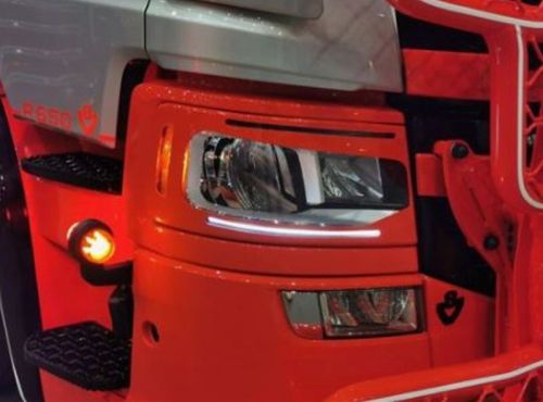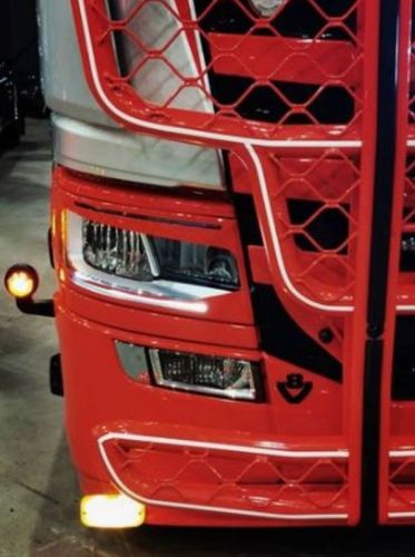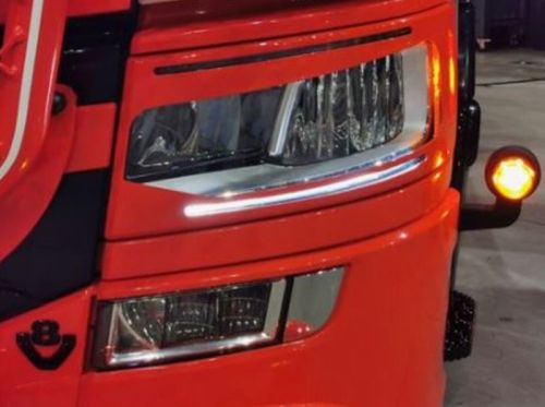 "Scania NGS koplampspoiler - Geschikt voor Scania NGS-koplampen (LED-versie) - Volledige afdekking, voor de gespoten koplamp look. - Geleverd met montagemateriaal - Uniek Solarguard-ontwerp - Gemaakt met 3D-scantechniek, gegarandeerde pasvorm. Geleverd als set ( Links & Rechts ) Moet gespoten worden."