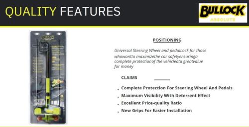 ? Universele antidiefstalvoorziening voor auto's ? Stuurwiel en pedaalvergrendeling ? Volledige bescherming voor stuur en pedalen ? Maximale zichtbaarheid met afschrikkend effect ? Uitstekende prijs-kwaliteitverhouding ? Antidiefstalslot gemaakt in Itali? ? Antivol universel pour voitures ? Verrouillage du volant et de la p?dale ? Protection compl?te du volant et des p?dales ? Visibilit? maximale avec effet dissuasif ? Excellent rapport qualit?-prix ? Serrure antivol fabriqu?e en Italie