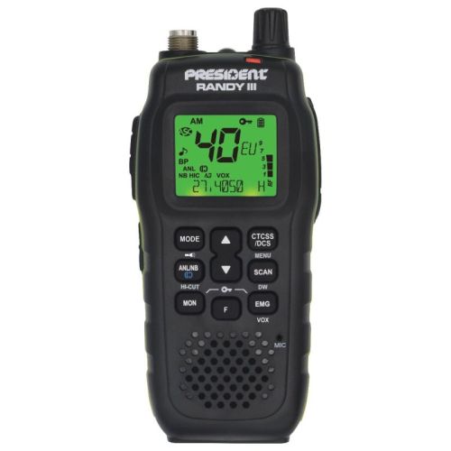 "De nieuwe President Randy 3 (III) is een robuuste 27MC (27MHz) Portofoon met een flexibele antenne en een groot en duidelijk afleesbaar LCD-display waarvan de verlichting instelbaar is in 7 verschillende kleuren. De President Randy 3 beschikt over 40 kanalen AM/FM en heeft een vermogen van 4 Watt AM/FM. Daarnaast beschikt de President Randy III over 38 CTCSS tonen en 104 DCS codes, ingebouwde VOX-functie, ANL, ASC etc. De President Randy 3 wordt compleet geleverd met een flexibele antenne, een 1800mAh Li-Ion batterij, een thuislader module met AC-adapter, een 12Volt laadmodule met externe antenne aansluiting en een aanstekerplug voor gebruik in 12Volt sigarettenaansterker. Daarnaast krijgt u er een riemclip, polsband, microfoonbeugel, en een reserve glaszekering bij. De President Randy 3 is door zijn robuuste behuizing en groot LCD-scherm uitermate geschikt voor gebruik in de 4x4- en Off-Road sport en Carbage Run, Barrel Challenge, Kauwgombal1500 en andere georganiseerde ritten en toertochten. Handzaam formaat, robuuste behuizing en uitgerust met veel doordachte functies: Zo presenteert het nieuwe CB-hand- en mobiele apparaat RANDY III zich! Omschakelbare nationale frequentietabellen (EU, EC, d, PL, in) zijn in de software opgeslagen. De landstandaard-afkorting, het ingestelde kanaalnummer en de modulatiewijze - alle belangrijke gegevens moeten op het grote verlichte display gemakkelijk worden afgelezen. Hiervoor informeert het LCD over de status van andere apparaatfuncties: De instelling van het zendvermogen (high of low) resp. de automatische ruiscontrole ASC (patent van de Groupe president Electronics), tweekanaals-bewaking (dual watch), Roger-Beep, selective belprocedure, VOX-functie, Laadcontrolelampje en toetsenbordvergrendeling. De RANDY III biedt bovendien een monitorfunctie (voor het kortstondig overbruggen van de ruisonderdrukking), een directe schakelfunctie voor kanaal 9/19 en een zoekfunctie voor een individuele scanlijst die moet worden opgenomen. AM/FM transceiver Frequentiebereik: 26.965 MHz tot 27.405 MHz 40 Kanalen 1800mAh, 7,4Volt Lithium-ion batterij Vermogen: 4 Watt AM en 4 Watt FM Up/down kanalen keuze Volume regeling met aan/uit functie Handmatige squelch ASC (Automatische squelch) Multi-functioneel LCD display Voeding: 7,4 Volt (met opgeladen accu) 13,2 Volt (met aanstekerplug in 12V aansluiting) Display instelbaar in 7 verschillende kleuren Oranje, groen, lichtgroen, blauw, lichtblauw, turquoise en paars Transmissie-interferentie: minder dan 4 nW (- 54 dBm) Audio respons: 300 Hz tot 3 KHz Uitgezonden vermogen in aanpasbaar kanaal: inferieur aan 20 ?W Gevoeligheid microfoon: 7 mV Gemoduleerde signaalvervorming: 2% Drain: 1,8 Amp. max. Frequentie display S-meter ANL Filter NB Filter HI-CUT Filter Scan functie F functie toets Ingebouwde VOX-functie Roger Beep Dual watch 38 CTCSS Tonen 104 DCS Codes Toetsen blokkering (keylock) functie Preset kanaal (EMG 1 & 2) (programmeerbaar) Eco mode Externe microfoon aansluiting Extrene luidspreker aansluiting (voor o.a. speaker microfoon) Externe antenne aansluiting in de autolaadmodule Frequentiebereik: +/- 200 Hz Zaklamp functie Selectiviteit aangrenzende kanalen: 60 dB Maximaal audiovermogen: 1 Watt Squelch-gevoeligheid: min. 0,2 ?V - 120 dBm / max. 1 mV - 47 dBm Afwijzing frequentie beeld: 60 dB Tussenfrequentie rej. snelheid: 70 dB Antenne impedantie: 50 Ohm Luidspreker: 8 ohm, 1 Watt Afvoer: Mode ECO Maxi. gevoeligheid bij 20 dB sinad: 0,5 ?V - 113 dBm AM / 0,35 ?V - 116 dBm FM Speaker microfoon aansluiting: ? 2.5 mm Afmetingen: 152 (H) x 66,5 (L) x 37 (P) mm Gewicht: 305gram met batterij Inhoud verpakking: 1 x President Randy 3 (III) 1 x Flexibele antenne (S-20) 1 x Thuislader module met AC adapter 1 x Li-Ion batterij 7,4V, 1800mAh (ACMR402) 1 x Mobiele laadmodule met externe antenne aansluiting en aanstekerplug voor 12Volt 1 x Microfoonbeugel 1 x Reserve glaszekering 1 x Riemclip 1 x Polsband 1 x Handleiding in het Engels, Pools, Frans en Spaans Compleet met: AC-voeding Flexibele antenne 20 cm Ondersteuning voor mobiele aansluiting Adapter voor thuislader Accu 1800 mAh Riem clip Mobiele adapterkit"