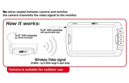 "Beschrijving: Monitor: ? 4.3? TFT color display ? resolution 480(W) x 272(H) ? 12~24V input voltage (cigarette lighter plug) ? digital wireless receiver (2.4Ghz) ? with suction cup bracket, including fully adjustable arm and monitor quick release Camera: ? 12~24V input voltage ? digital wireless transmitting (2.4Ghz - up to 50m range in open area) ? water and weather resistant (IP66) ? autofocus and white balance ? 6 UV LEDs ? Merk: Caliber ? Selecteer: Wireless (Digital) Water/weather proof Nightview Camera + Display set 12/24VDC (Car+Truck) suitable "
