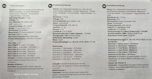 "DTS Melody Horn 24V met afstandsbediening ? Meer dan 19 verschillende melodie?n Breng uw truck tot leven met de DTS Melody Horn 24V, met meer dan 19 populaire melodie?n! Deze krachtige luchthoorn is ontworpen voor vrachtwagenchauffeurs en autoliefhebbers die op zoek zijn naar een unieke manier om hun voertuig te personaliseren en op te vallen. De DTS Melody Horn biedt indrukwekkende geluidsniveaus en wordt geleverd met een handige afstandsbediening om verschillende melodie?n te selecteren. ? Voltage: 24V voor krachtige prestaties. ? Aantal melodie?n: Meer dan 19 verschillende melodie?n, waaronder populaire hits zoals Baby Shark en nog veel meer. ? Afstandsbediening: Bedien de hoorn eenvoudig op afstand om uw gewenste melodie te selecteren. ? Geluidsniveau: Meer dan 130 dB ? gegarandeerd dat u opvalt! ? Installatie: Vereist een luchtsysteem met een druk tussen 8-12 bar (aanbevolen 8-10 bar) en een luchttank met een minimale capaciteit van 10 liter. ? Materiaal: Duurzame aluminium luchthoorns voor langdurig gebruik. Let op: De DTS Melody Horn vereist een luchtsysteem en compressor, die niet bij de aankoop zijn inbegrepen. Het wordt aanbevolen om de installatie door een gekwalificeerde technicus te laten uitvoeren om optimale prestaties te garanderen. Het hoge geluidsniveau kan de aandacht trekken, dus wees u bewust van de lokale regelgeving met betrekking tot het gebruik van luchthoorns."