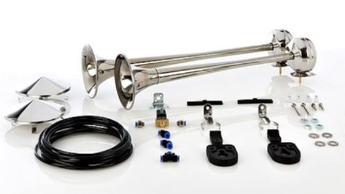 Inox klaxonset van goeie kwaliteit / Werkt enkel op luchtdruk! 108dB / 2240g / E3 / 1x 65cm + 1x 70cm / Compleet met installatiekit en electroklep 24V !