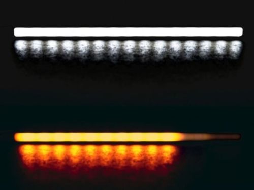 Set van 2 stuks / 12V ! Accent Dual LED Slim combined DRL and running indicator. This means that it has two functions: DRL / position light (xenon white) and running indicator (orange). Running indicator is the same type of indiciator found on eg. newer Audi models. Also called meteor / flowing indicator. Specifications: Dual functions (DRL/flowing indicator) 100% waterproof (IP65) Easily mounted with 3M tape attached Two lights with 29 LEDs each Cable length 100 cm Aluminum casing and epoxy plastic for evenly distributed light Only for 12V (passenger cars)