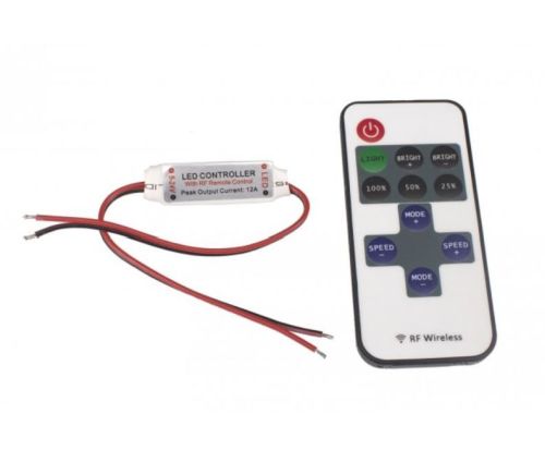 Dimmen met draadloze afstandsbediening om LED-verlichting te regelen. Het bereik van de afstandsbediening is ongeveer 20 m op een open oppervlak. Dimmer met 16 verschillende helderheidsniveaus 8 verschillende dynamische effecten op 16 verschillende snelheden Max belasting: 6A (piek) Slank ontwerp PWM-beoordeling: 256 12-24V Afstandsbediening Frequentie: 433.92 Mhz Afstandsbediening bereik ongeveer 20 meter (open oppervlak) Voeding met een 3V CR2025-batterij (inbegrepen in de afstandsbediening) Gedetailleerde instructies zijn inbegrepen