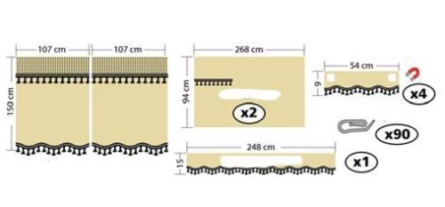 BEIGE / Bevat: 2x zijgordijnen 94cm /1x voorraamgordijn 15cm / 1x tussengordijn 150cm / 4x gordijnbandjes / 90 haakjes