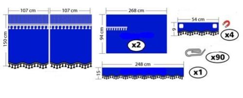 BLAUW / Bevat: 2x zijgordijnen 94cm /1x voorraamgordijn 15cm / 1x tussengordijn 150cm / 4x gordijnbandjes / 90 haakjes
