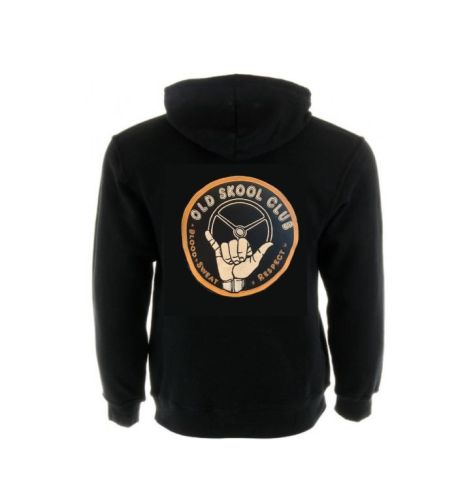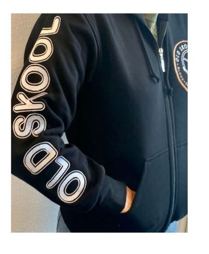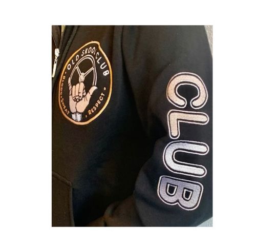 "Zwarte hoodie met rits en geborduurde print van hoge kwaliteit op beide mouwen, achterkant en voorkant Maat: S Dit model valt klein, we raden je aan de volgende maat groter te nemen voor een comfortabelere pasvorm"