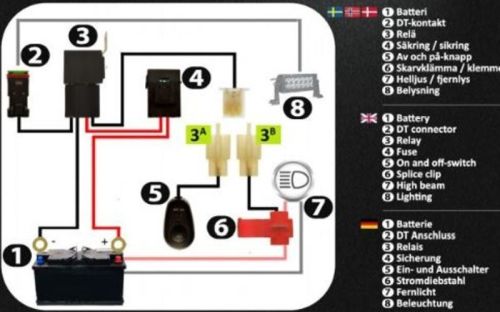 "Relais met DT-connector en knop voor eenvoudige aansluiting van extra licht of LED-balk. Een externe lamp of een LED-balk heeft slechts ??n DT-connector nodig. Twee lampen vereisen twee DT-connectoren, enz. Bedien uw extra licht met de aan/uit-knop die handig in het voertuig is geplaatst of door rechtstreeks verbinding te maken met het grootlicht (het buitenlicht gaat automatisch branden wanneer u overschakelt naar uw grootlicht en dooft wanneer u terugkeert naar het dimlicht). Werkt met voertuigen zowel met als zonder Canbus. ? 2x DT-connector ? relais 24V 40A ? Schakelaar ? Zekering tot 80A"