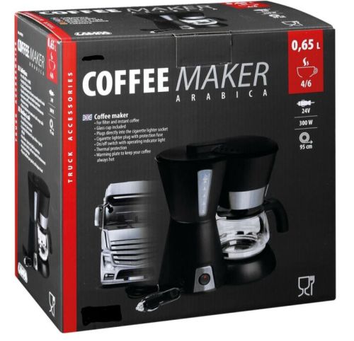 "Koffiezetapparaat Arabica - 24V - 300W Voor filter- en oploskoffie Inclusief glazen beker Kan rechtstreeks in de sigarettenaansteker worden gestoken 95 cm kabel Sigarettenaanstekerplug met veiligheidszekering Aan/uit-schakelaar met bedrijfsindicatielampje Thermische bescherming Warmhoudplaat om je koffie altijd warm te houden Capaciteit 0,65 L (4/6 kopjes)"