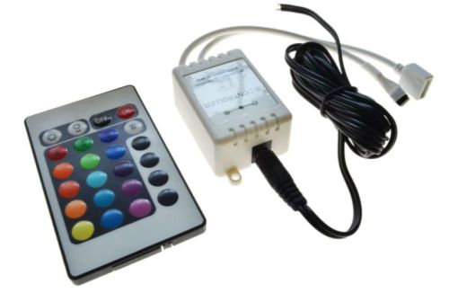 "500cm RGB flexistrip voor 24V. Alleen voor gebruik binnenshuis. RGB Controller voor RGB-strips met 15 verschillende kleurnuances. Werkt tot 15 meter RGB-strip (3,6W/m). Functies: Kies uit 15 verschillende effen kleuren Dimbaar Aan uit Stroboscoopfunctie: Fade - instelbare snelheid Kleurenstroboscoop - instelbare snelheid De batterij voor de afstandsbediening is een CR2025, deze wordt meegeleverd. De controller kan 6A aan, oftewel ongeveer 13 meter RGB strip (met 5050 SMD)."