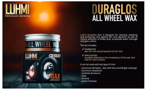 "? Zeer effectieve wax voor het reinigen, polijsten en beschermen van uw velgen ? Geschikt voor alle types velgen, eveneens voor Durabright velgen ? Voor Alcoa Durabright velgen maar ook voor gespoten velgen! ? Reinigt, polijst (licht) en beschermd je velgen tegen vuil en remstof ? Geeft een ultieme glans ? Veilig te gebruiken op gepolijste en gelakte velgen maar ook op plastic wielmoerdoppen ? Komt met applicator om deze wax aan te brengen ? 250 gram per potje"