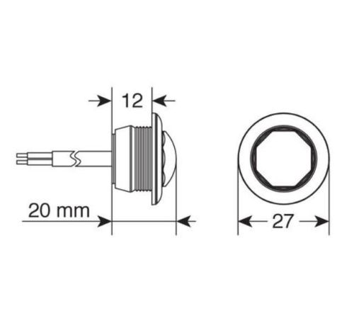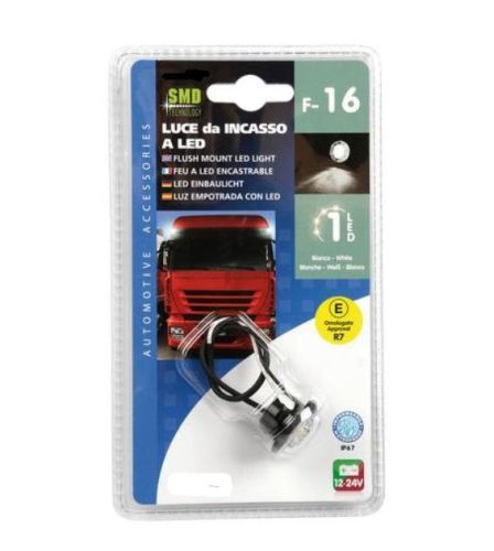 "12V+24V /Diameter 2,7cm / diepte 1,2cm / Hoogte na inbouw = 0,7cm / Te boren gat 18mm / SMD technologie / ECE-gekeurd / IP67"