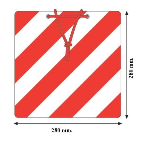"28cm x 28cm x 1mm / Retroreflekterend / met 2 gaten + koord / Per stuk geleverd. Ingevolge een wetswijziging (Belgisch Staatsblad 09/09/2013 : Wijzigingen aan het Koninklijk besluit van 2 juni 2010 betreffende het wegverkeer van uitzonderlijke voertuigen), zijn de eigenschappen waaraan het paneel voor uitstekende ladingen (Om de lading die meer dan ??n meter buiten het achtereinde van het voertuig uitsteekt te signaleren) moet voldoen, gewijzigd. De retro-reflecterende rode en witte strepen voldoen aan de fotometrische en colorimetrische voorschriften van de internationale normen, zijnde retro-reflecterende strepen van van type 3 klasse C van Reglement nr.104"