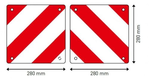 Panelen voor uitzonderlijk vervoer & landbouwvoertuigen / 28cm x 28cm / Set van 2 stuks (links + rechts) / Witte ?n rode strepen zijn retroreflecterend. Op elk paneel moet ten minste ??n van de retroreflecterende strepen voorzien zijn van een markering. Deze panelen voldoen aan de wettelijke normen klasse 3.