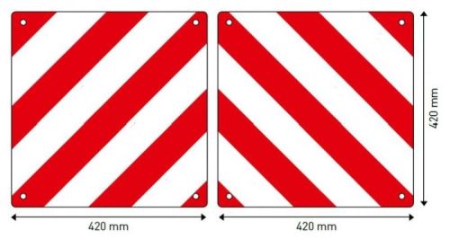 ? Panelen voor uitzonderlijk vervoer & landbouwvoertuigen ? Aluminium ? 42cm x 42cm ? Dikte 1mm ? Set van 2 stuks (links + rechts) ? Witte ?n rode strepen zijn retroreflecterend. ? Op elk paneel moet ten minste ??n van de retroreflecterende strepen voorzien zijn van een markering. ? Deze panelen voldoen aan de wettelijke normen (RA2 van de norm NBN EN 12899-1)