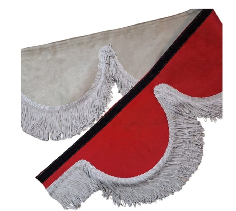 Voorraamband met grote bogen + lange franjes Alcantara dubbel gevoerd - zware kwaliteit Kleur band te kiezen -> Kleur BINNENKANT + kleur BUITENKANT : Kleur franjes te kiezen : lengte franjes : 45 mm of 75 mm. Velcro voor montage op voorruit NIET inbegrepen (ref. 03410104)