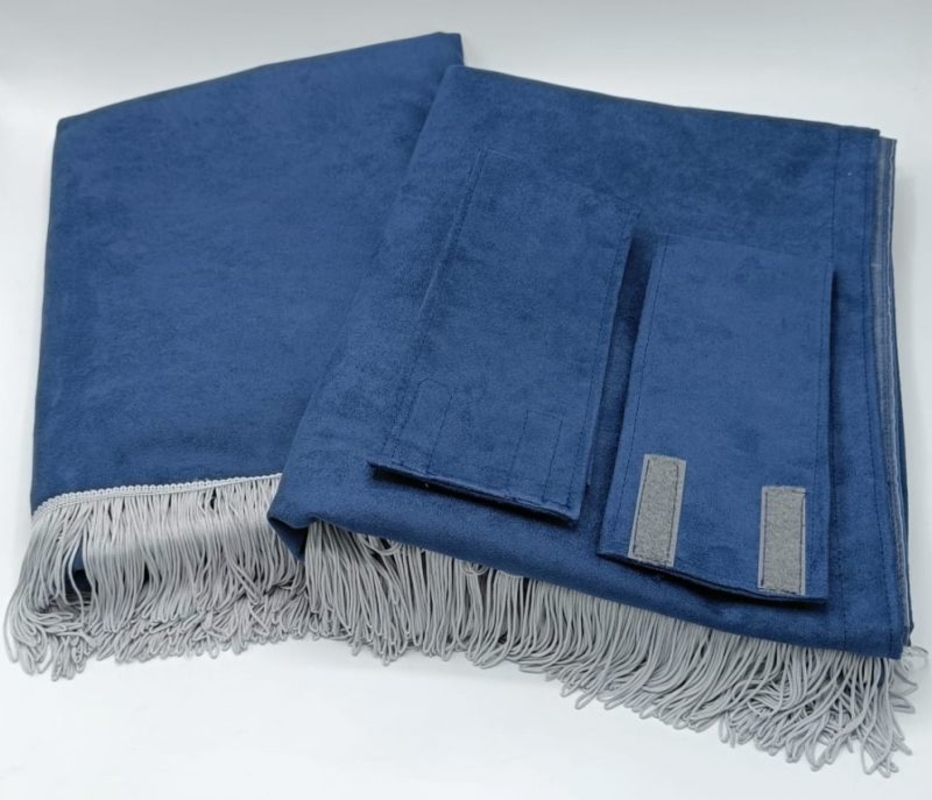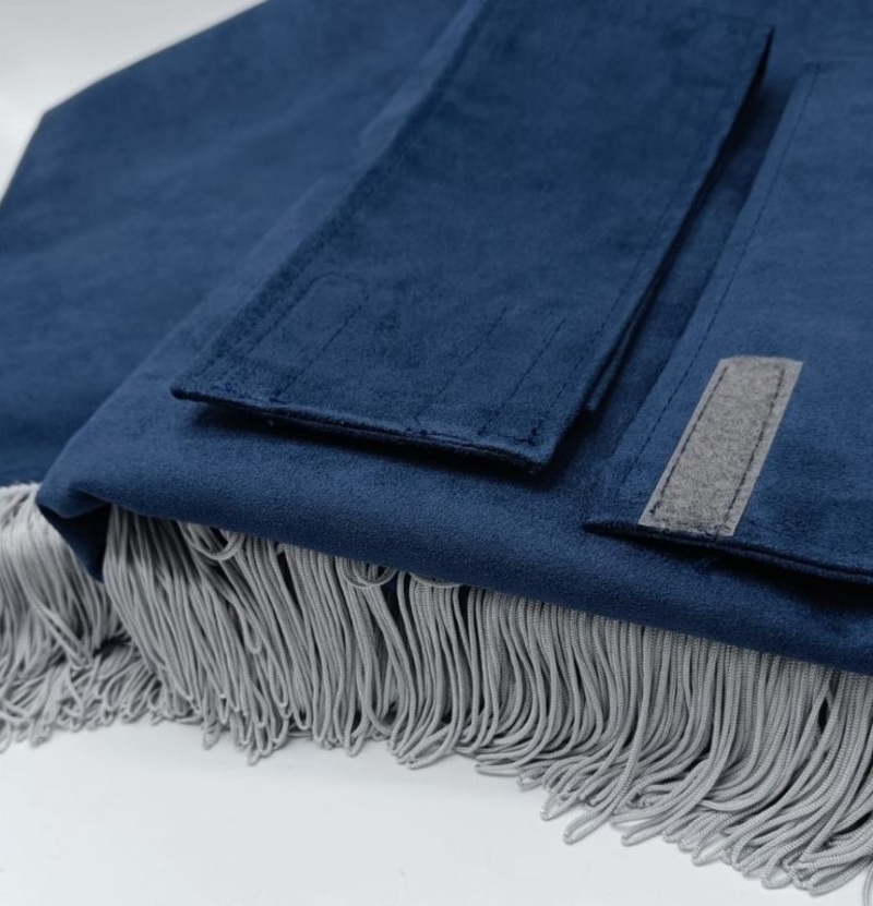 Set zijgordijnen van supérieure kwaliteitstof hoogte 85 cm. Alcantara dubbel gevoerd - zware kwaliteit Kleur gordijnen blauw 616 Kleur franjes : 210 - lengte : 75 mm. inclusief 2 gordijnbandjes.