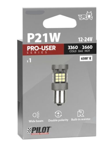 12/24V Pro-User Serie - (P21W) - BA15s - 1 stuk - Doos - Wit - Dubbele polariteit - Ingebouwde weerstand Led-lampen van de nieuwste generatie. Ontwikkeld met Halo-Led-technologie en geminiaturiseerd ter vervanging van standaard gloeilampen met fittingen voor gebruik in of buiten de auto. • Leds met lage warmteafgifte • Zeer hoge lichtstroom (lumen), zowel koud als warm • Hoog vermogen in watt • Geschikt voor gebruik op voertuigen met een CAN-bussysteem (voorkomt dat het waarschuwingslampje aangaat) • Afmetingen: 20,5 x 49,2 mm