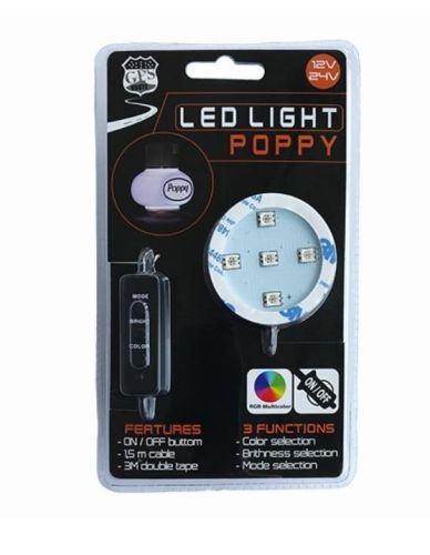 "RGB / 12V + 24V / Met stekker voor sigarettenaansteker / 1,5 meter kabel / Wordt gemonteerd onder Poppy met sterk 3m dubbelzijdige tape / Deze Poppy verlichting maakt van een standaard Poppy een sfeervolle verlichting voor in je cabine. Wordt zonder Poppy geleverd. 7verschillende kleuren met dimmer en verschillende patronen oa: flash en knipperen "